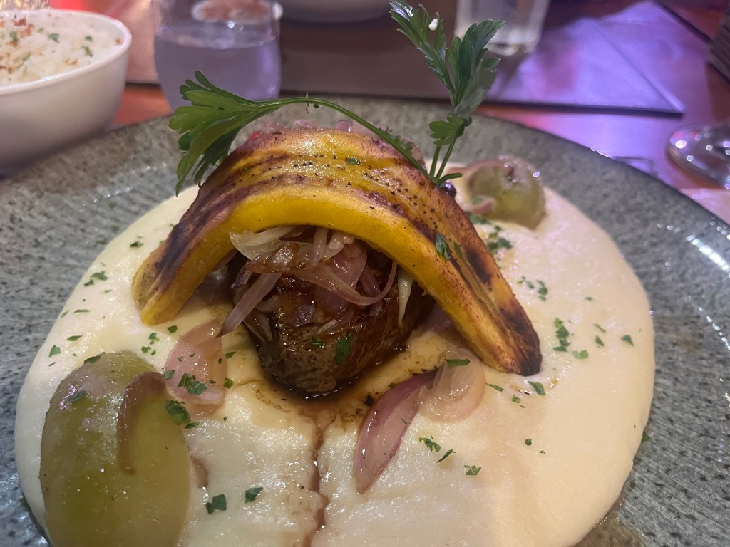 On dîne dans un restau du Nordeste, on est parti sur un délicieux morceau de bœuf grillé, coiffé d’une banane langoureusement allongée sur sa purée de plantain. Mariage surprenant mais très heureux. On s’endort épuisé, des images de pierres cassées qui défilent sous nos pieds. heureux d’être rentré entier de cette journée acrobatique et en dehors des sentiers.